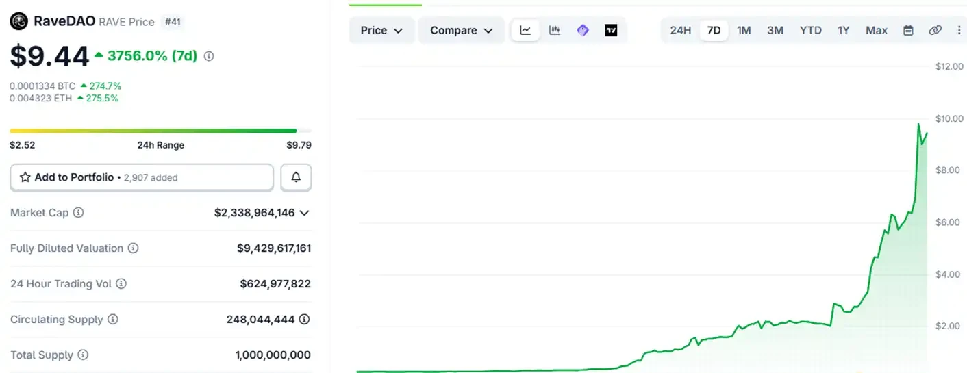 今年的币圈,有一个绕不开的概念,就是「妖币」。在过去的一周,$RAVE 的价格不断上涨,最高增至一周前约 40 倍。如今,$RAVE 的市值已经来到了市场第 41 名。