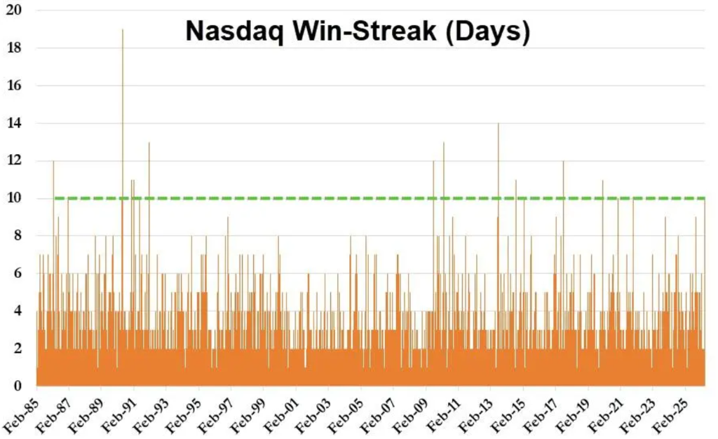 过去一段时间,华尔街正在选择性地”屏蔽噪音”。标普500指数自3月27日以来累计上涨近10%,纳斯达克100同期涨幅约12%,连续10个交易日收涨——这是该指数自2021年以来最长的连涨纪录。