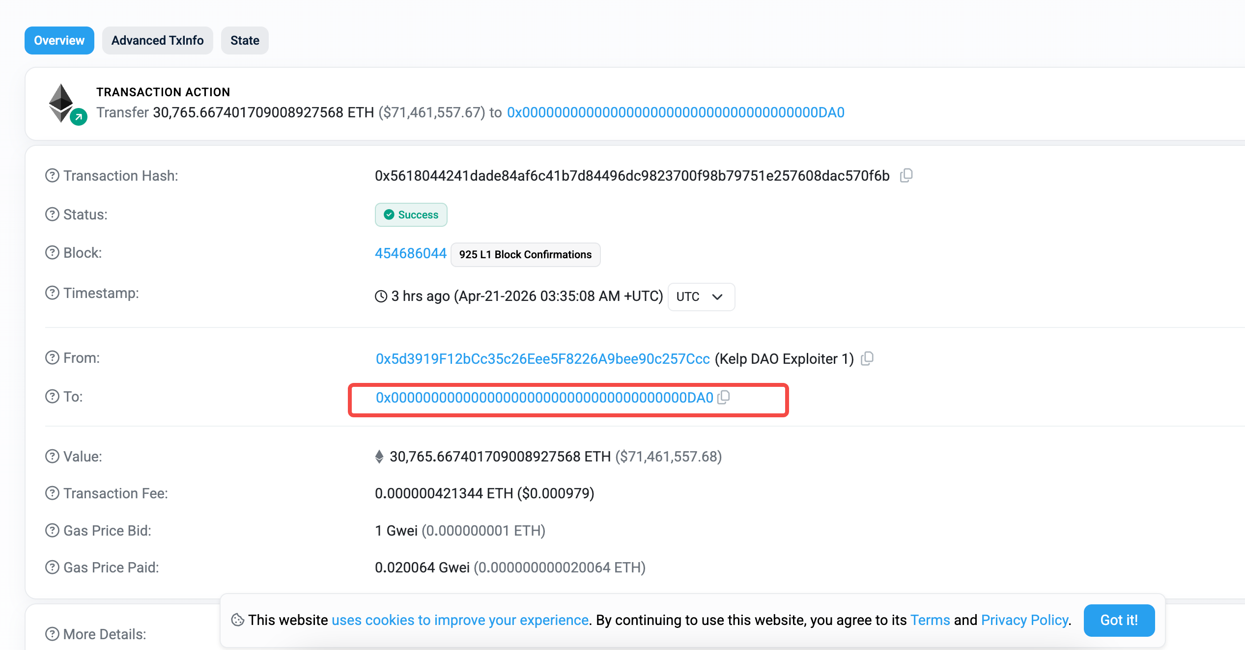 被偷的 ETH 现在散落在多条链上,其中大约 30765 个留在了 Arbitrum 链上的一个地址里,价值 7000 多万美元。