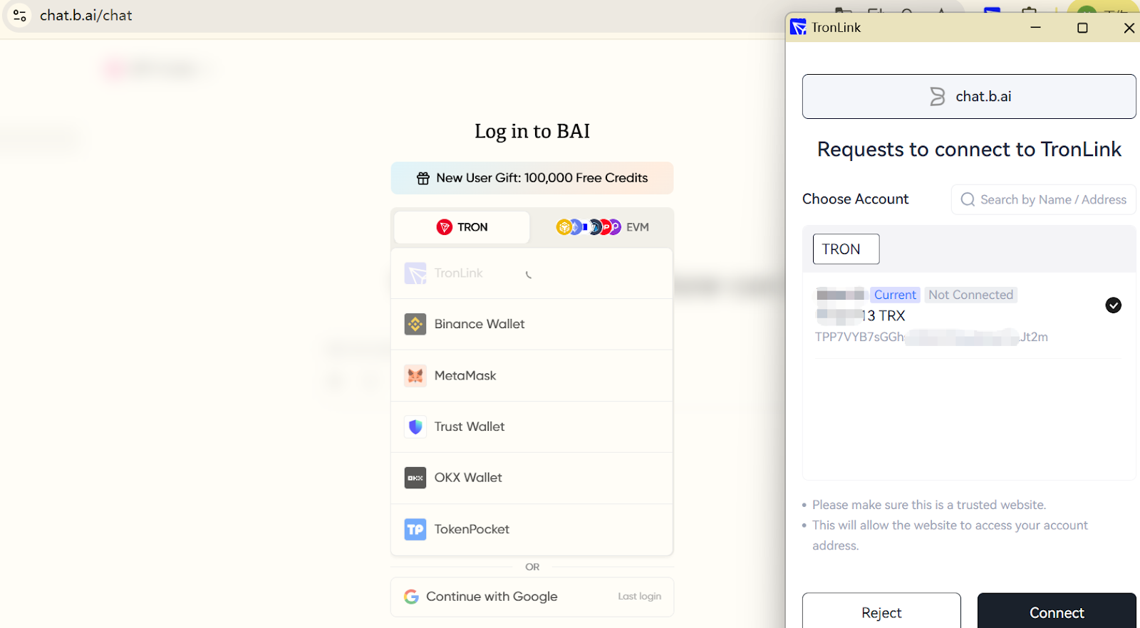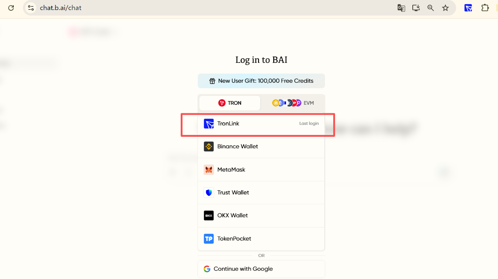 B.AI LLM 服务现已支持波场 TRON 以及多条主流 EVM 兼容链(如 BNBChain、以太坊、Base、Arbitrum、Polygon、Optimism 等),用户可使用 TronLink、Binance Wallet、MetaMask、TrustWallet、OKX Wallet、TokenPocket 等加密钱包一键授权匿名登录。