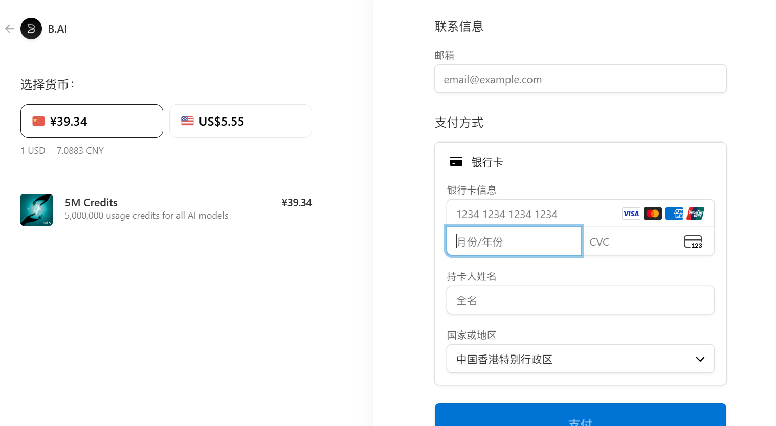 2、法定货币充值:目前 B.AI LLM 服务已接入 Stripe 支付,支持使用 Visa、银联等方式付款。未来,将逐步引入更多第三方支付选项如谷歌 Pay 等,以提供更灵活、更便捷的支付体验。
