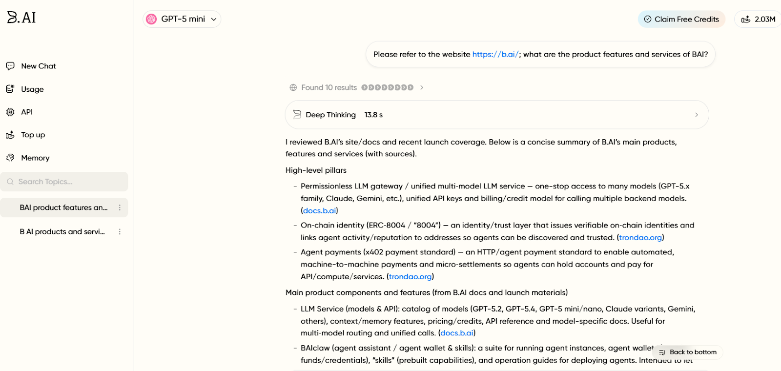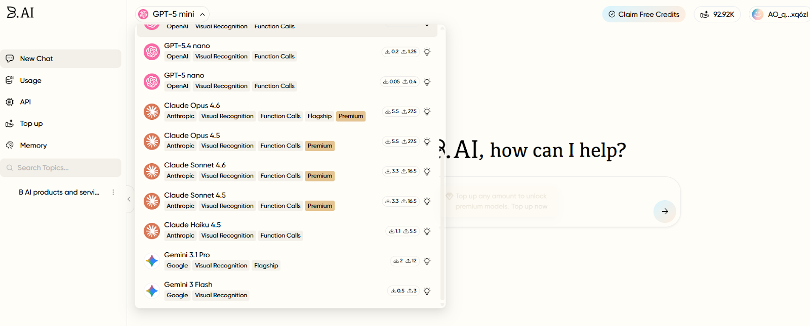 进入 B.AI LLM 服务页面后,用户即可与多款全球顶尖 AI 模型进行对话交互。目前,B.AI LLM 服务已完成对全球主流 AI 大模型的全面集成,形成了覆盖“国际顶尖 + 国内高性价比”的多元化模型矩阵。