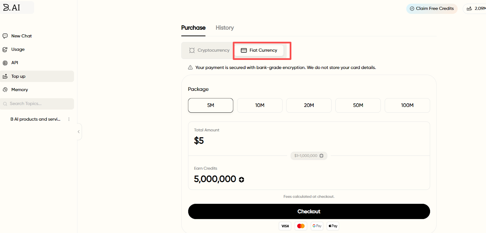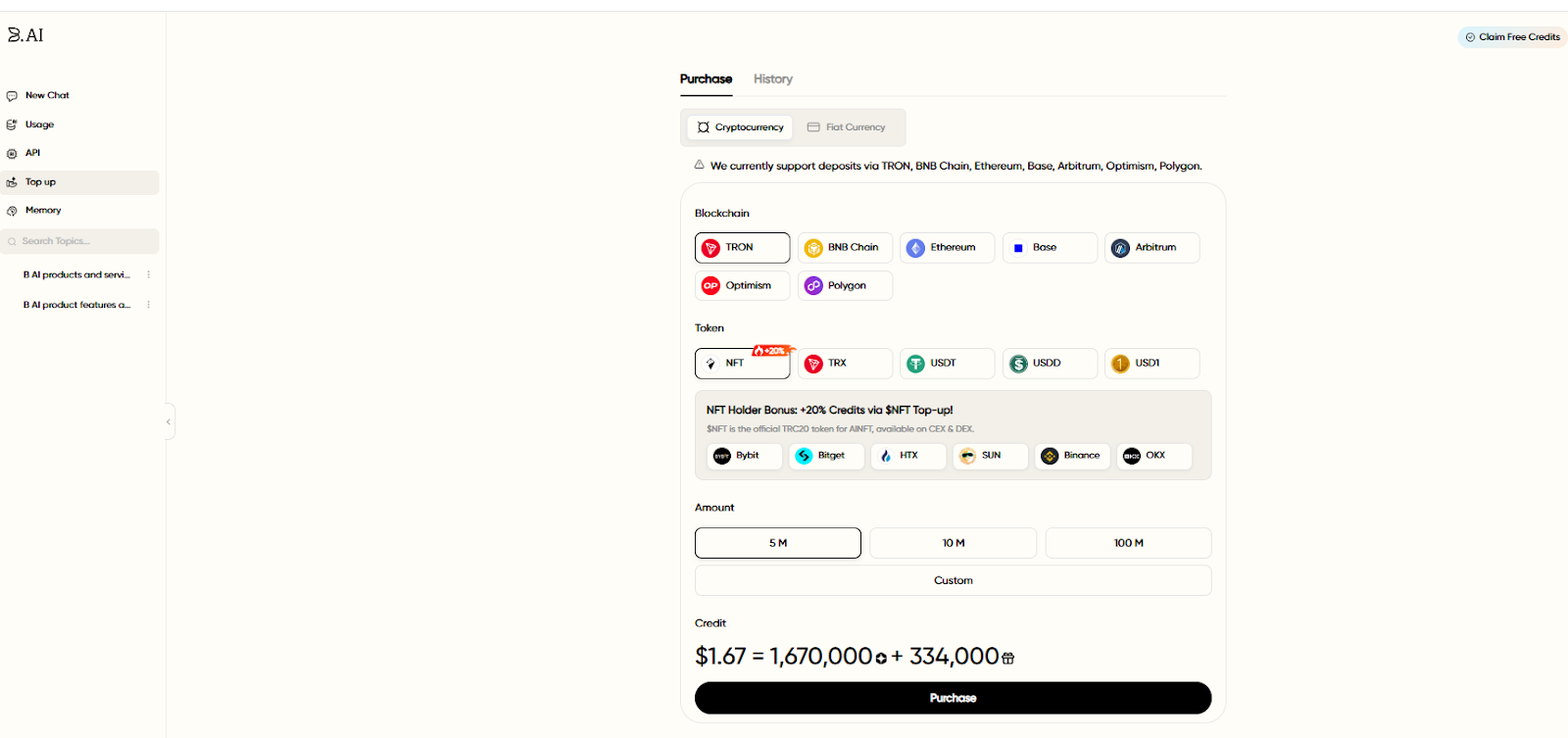 B.AI 现已打通 Web2 与 Web3 支付链路,支持使用加密货币和法定货币两种方式充值,满足全球用户需求: