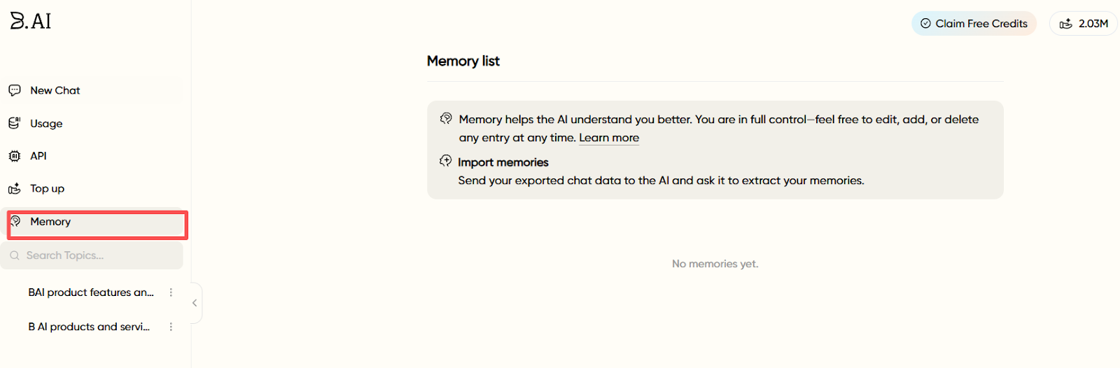 此外,B.AI LLM 服务还提供 Memory 记忆功能,可自动学习并留存用户的交互背景,从而更精准地理解需求。用户可随时进入记忆库,对任意条目进行编辑、新增或删除,确保信息准确且隐私可控。