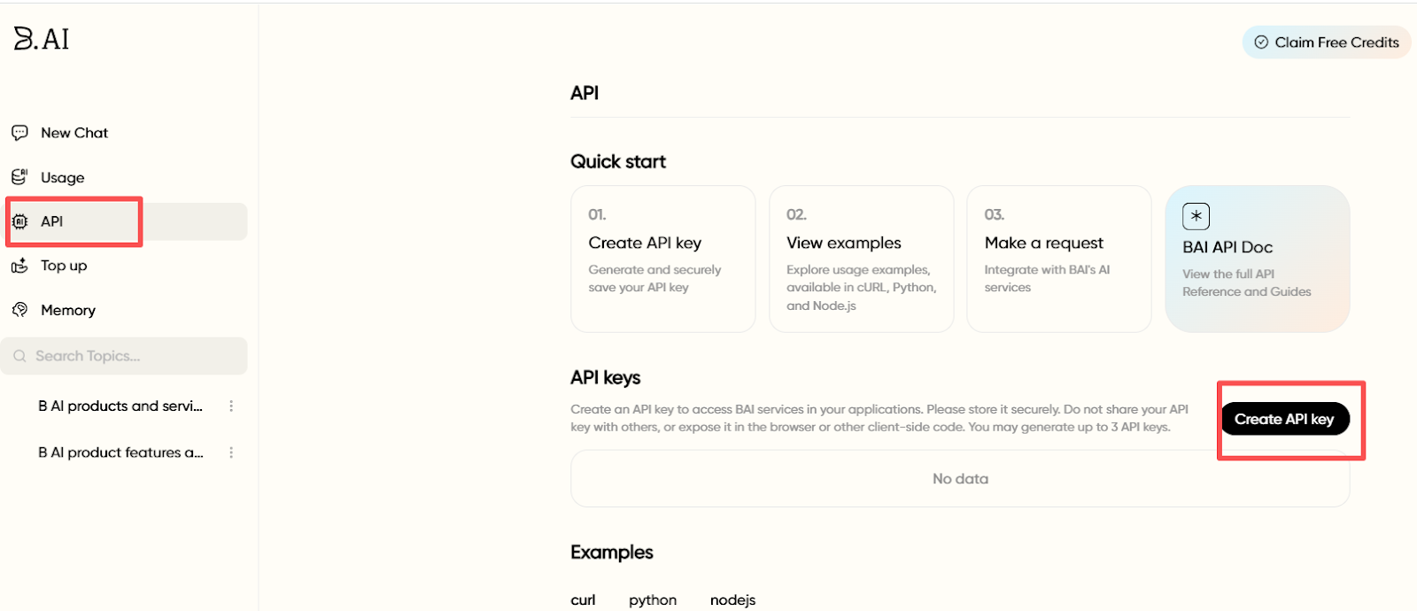 针对开发者及 AI Agent 用户(如 OpenClaw、Hermes Agent、Claude Code、Cursor 等),B.AI 提供极简、标准化的统一 API 接入方案:用户仅需创建一个 B.AI API Key,便可一站式调用所有集成 AI 模型的 API,涵盖如 Claude、GPT、MiniMax、Kimi 等主流模型,省去向不同服务商重复申请、管理多套 API 的繁琐流程。