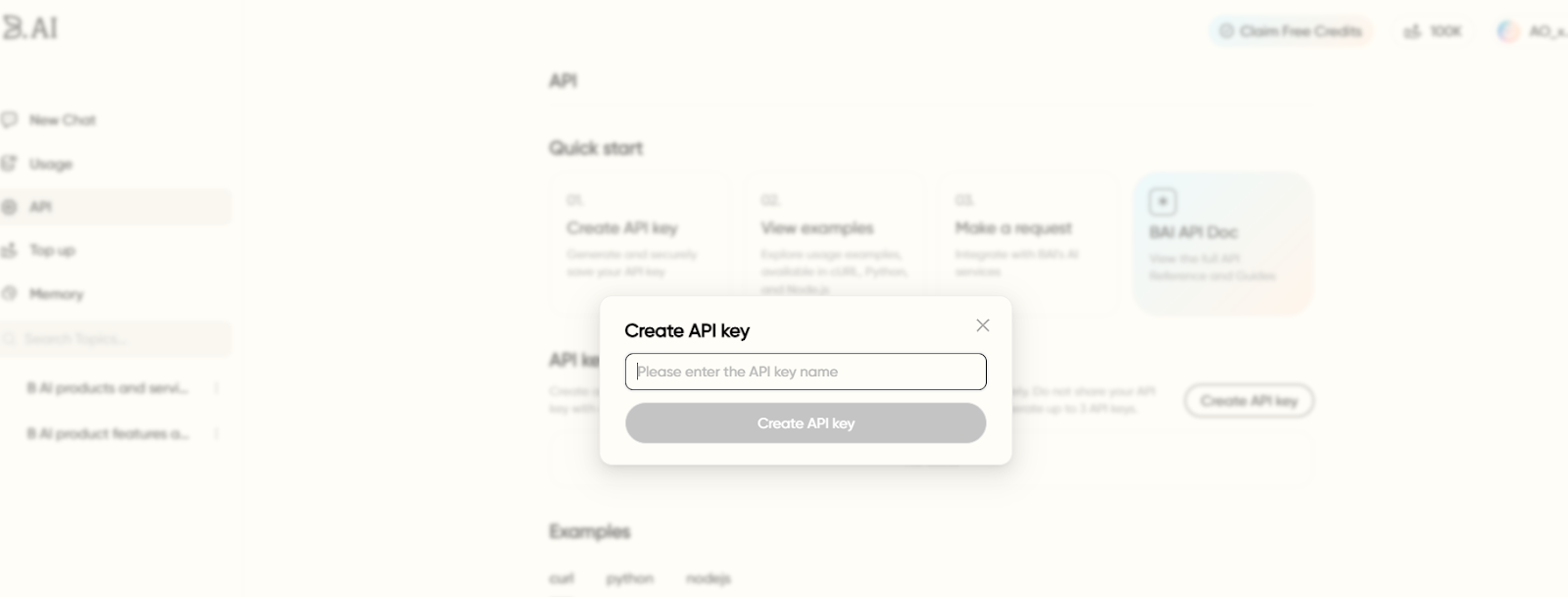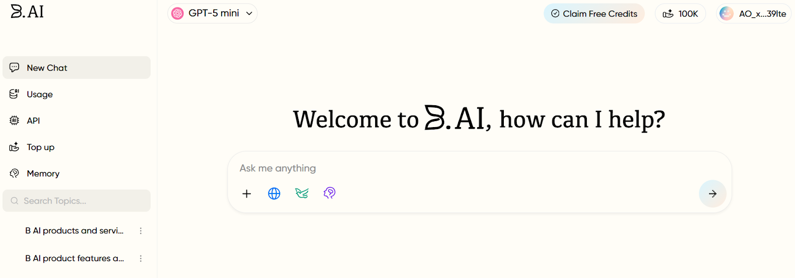 B.AI 支持 Web3 钱包与 Web2 社交账号双重登录方式。首次登录的用户可零门槛领取 100,000 免费 AI 积分,该积分通用于平台所有 AI 模型的对话及 API 调用。