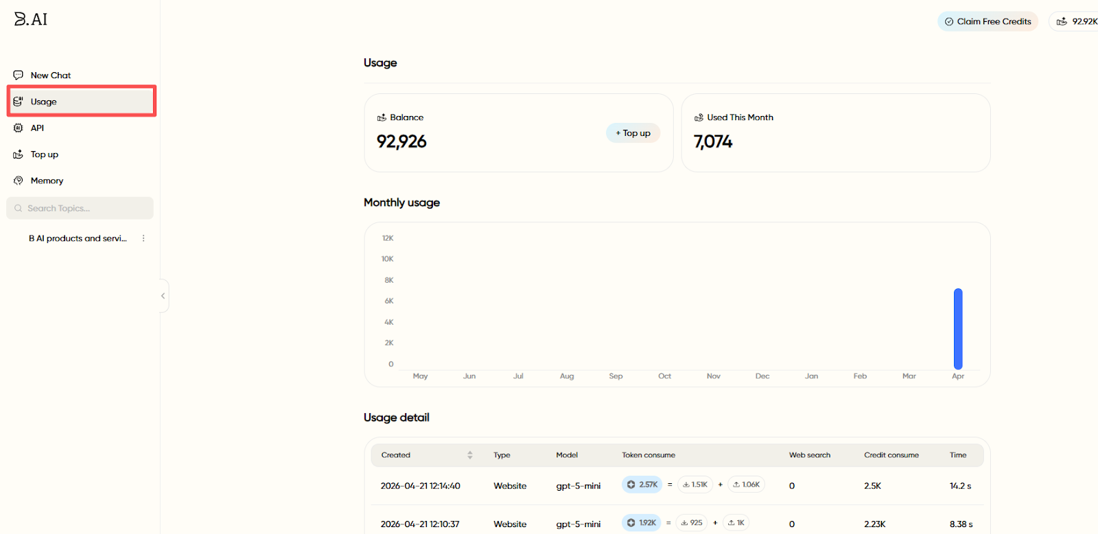 对于积分的使用明细,用户可以在左侧菜单栏的「Usage」页面,随时查看账户余额及每一笔交互的积分消耗明细。
