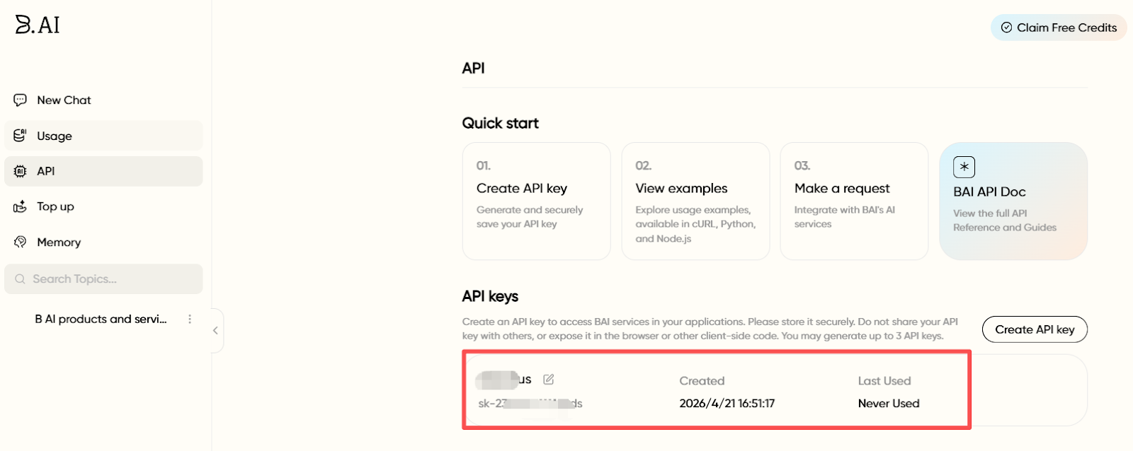 具体操作步骤为:在 B.AI LLM 服务页面左侧菜单栏中的「API」管理界面,点击「Create API Key」按钮,系统将生成一个专属的 API Key。然后该 API Key 可填入(如 OpenClaw、Claude Code、Cursor 等) AI Agent 的 API 接入配置文件,即可完成一站式调用 LLM 服务 API。