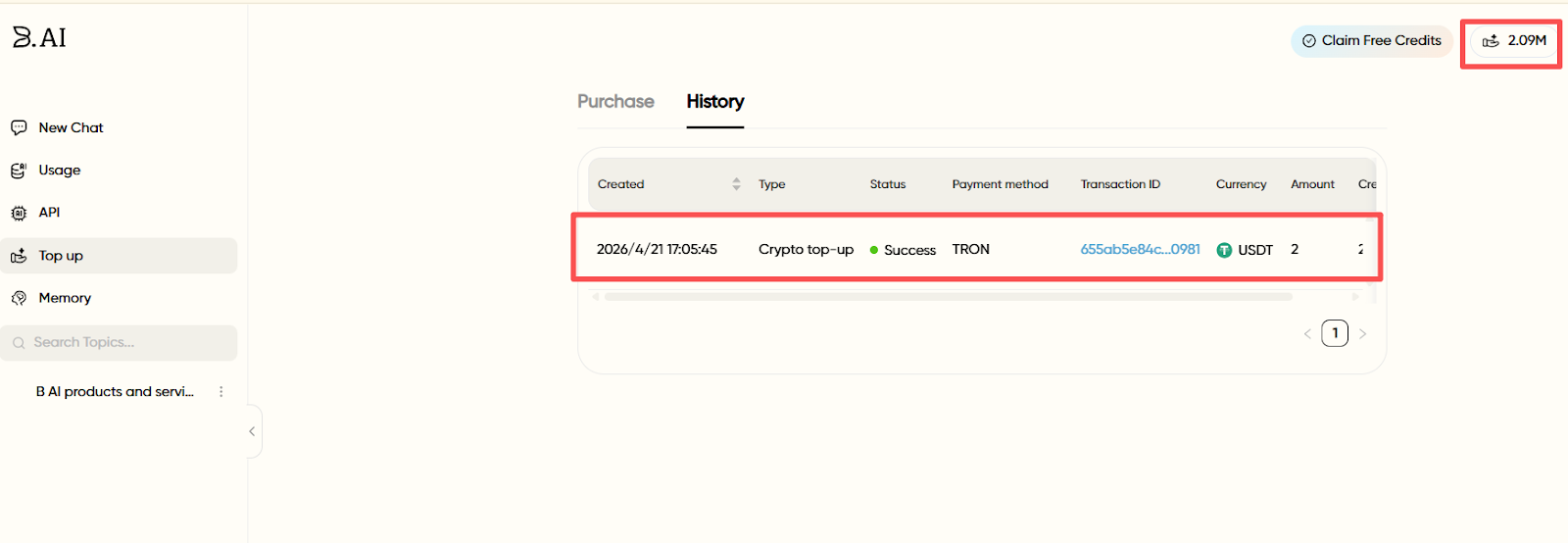 1、加密货币充值:目前 B.AI LLM 服务已支持波场 TRON、BNB Chain、以太坊、Base、Arbitrum、Optimism、Polygon 等网络,充值资产支持使用 NFT、TRX、USDT、USDD、USD1 多种加密货币进行充值。充值成功后,记录可以在充值历史数据查看,账户积分会自动增加。值得注意的是,若使用 NFT 进行充值,用户将额外获得 20%的积分奖励。