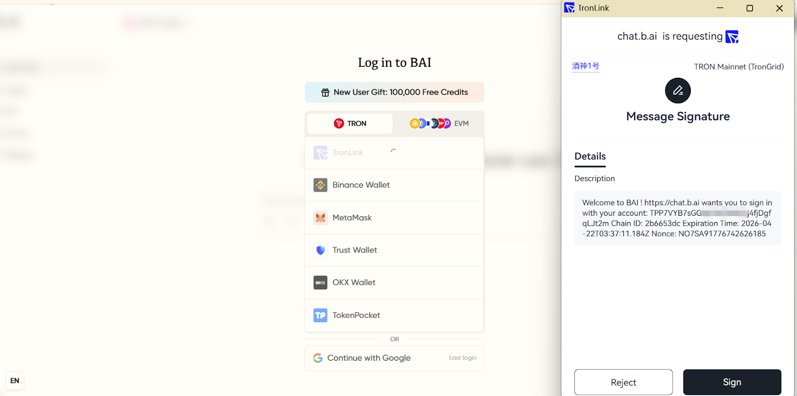 - 连接钱包并授权登录:访问 B.AI LLM 服务页面,点击“TronLink”图标,系统将自动唤起钱包插件,点击“Sign”授权即可登录。