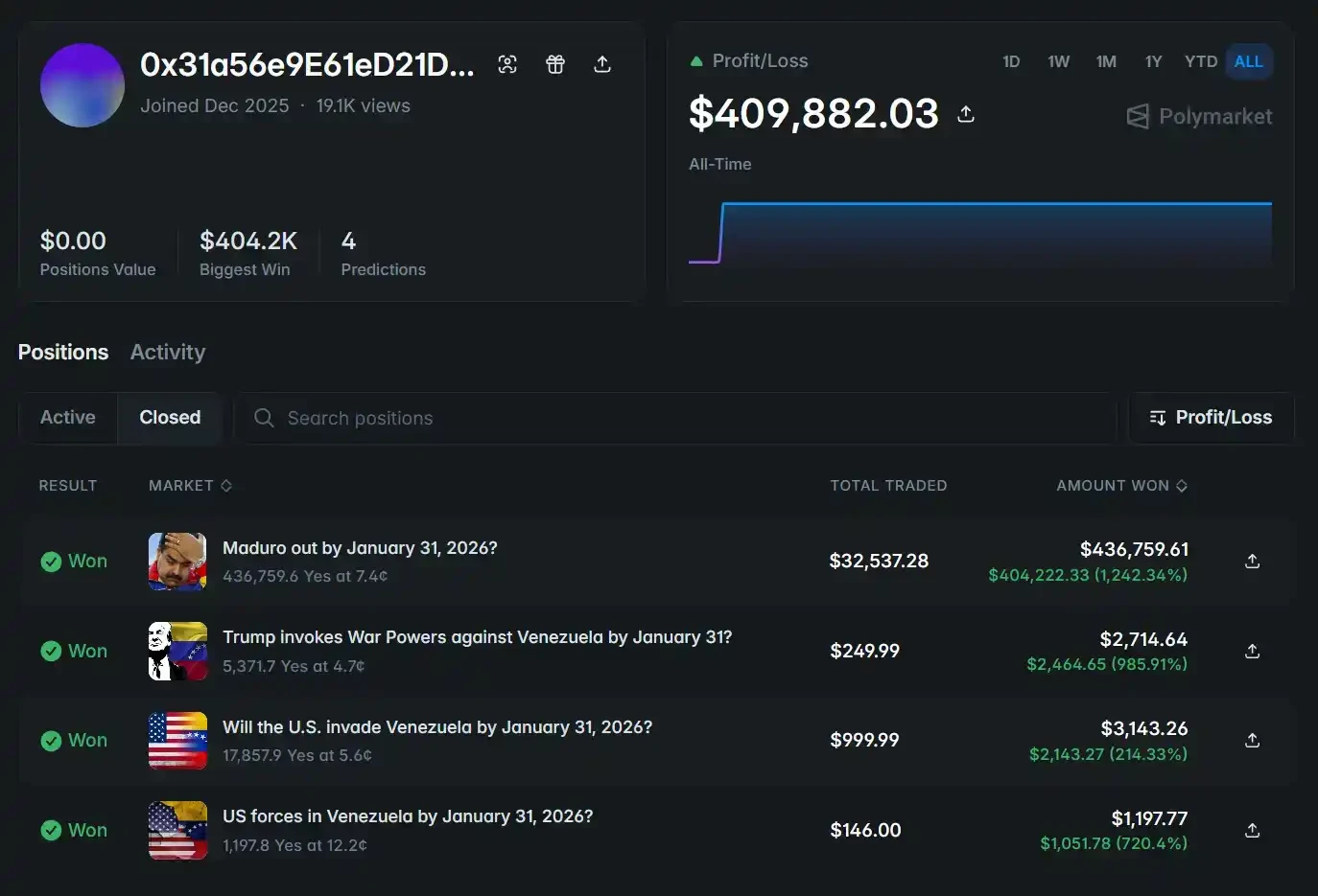 据报道,Van Dyke 在行动前夕通过预测市场押注马杜罗将被抓捕,赚了超 40 万美元。报道虽未公开具体的账户信息,但通过其中提及的押注方向和盈利数额,我们比对到了账户 0x31a5。