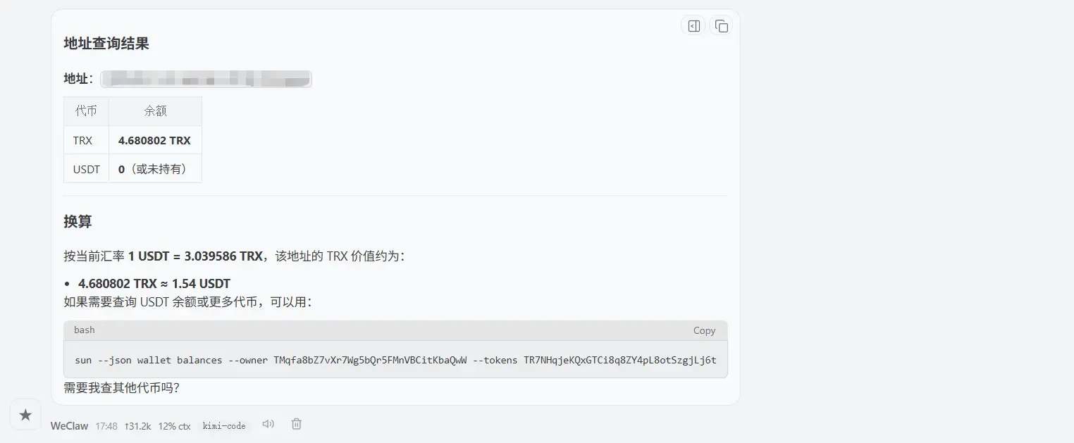 得益于 Skills 互相独立又可无缝组合的“乐高”特性,用户可以给 AI 下达包含多个步骤的复合任务,让它自主调用不同的组件来完成闭环。例如,“请先查一下我地址(输入你的地址)里目前有多少 USDT 余额,按现在SunSwap的最优汇率帮我测算一下,如果把我所有的TRX都换成 USDT,大概能换多少?”