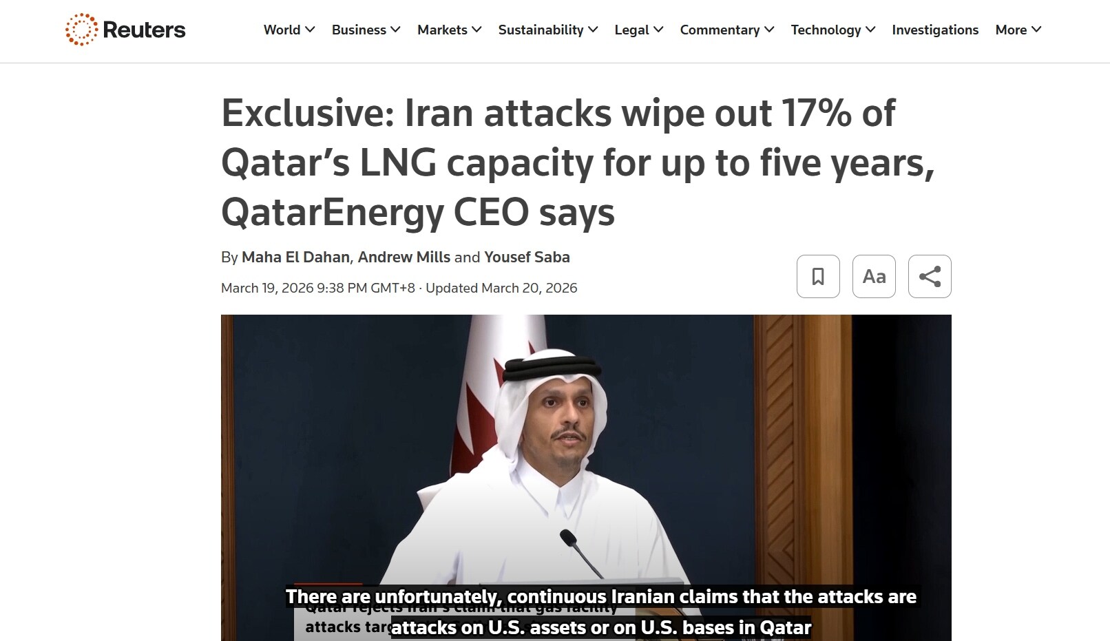 2026 年 2 月末,美以对伊朗发动军事打击,伊朗随即限制霍尔木兹海峡通行,全球能源运输最关键的咽喉之一被迫进入半冻结状态,此后卡塔尔最大的天然气设施拉斯拉凡工业城连续遭到袭击,全球最重要的 LNG 生产与出口枢纽之一被迫停摆。​