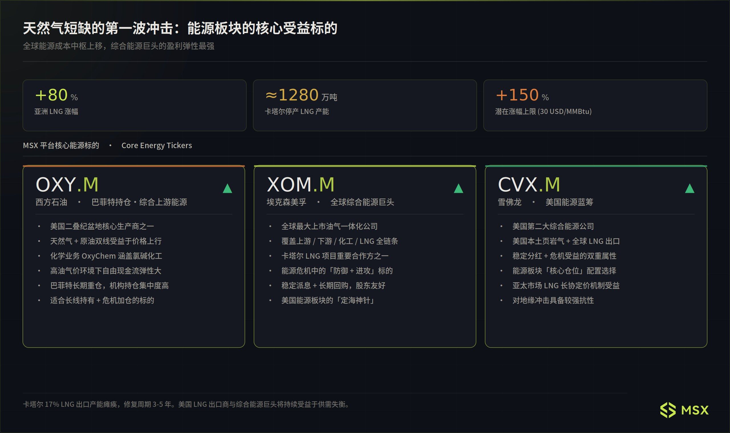 这条链条的受益方非常直接,即美国等非中东 LNG 出口商,以及具备稳定产能和出口能力的能源企业,无疑会成为替代供应的最大赢家,譬如 MSX 已上线的 OXY.M、XOM.M、CVX.M,分别对应巴菲特长期持仓的西方石油、全球油气一体化龙头埃克森美孚,以及兼具美国本土页岩气和全球 LNG 出口能力的雪佛龙。