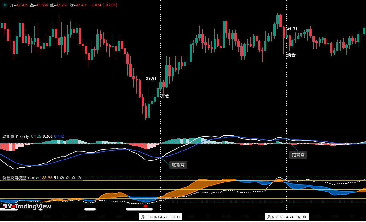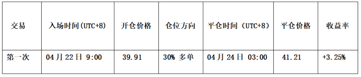平仓策略:当价格上涨至 42 美元附近时遇阻,同时动能量化模型触发顶背离信号,因此,我们于 41.21 美元附近全部清仓。