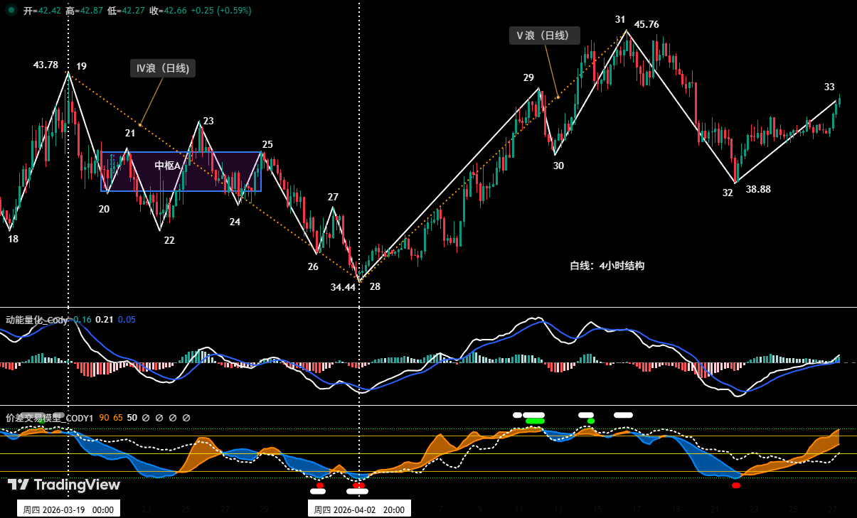 1、如(图一)所示,自 4 月 2 低点 34.44 美元启动的日线级别Ⅴ浪上涨行情,在 4 小时周期中可进一步细分为一个五段式上涨结构,即 28-29、29-30、30-31、31-32、32-33,目前市场正在运行 32-33 上涨段。