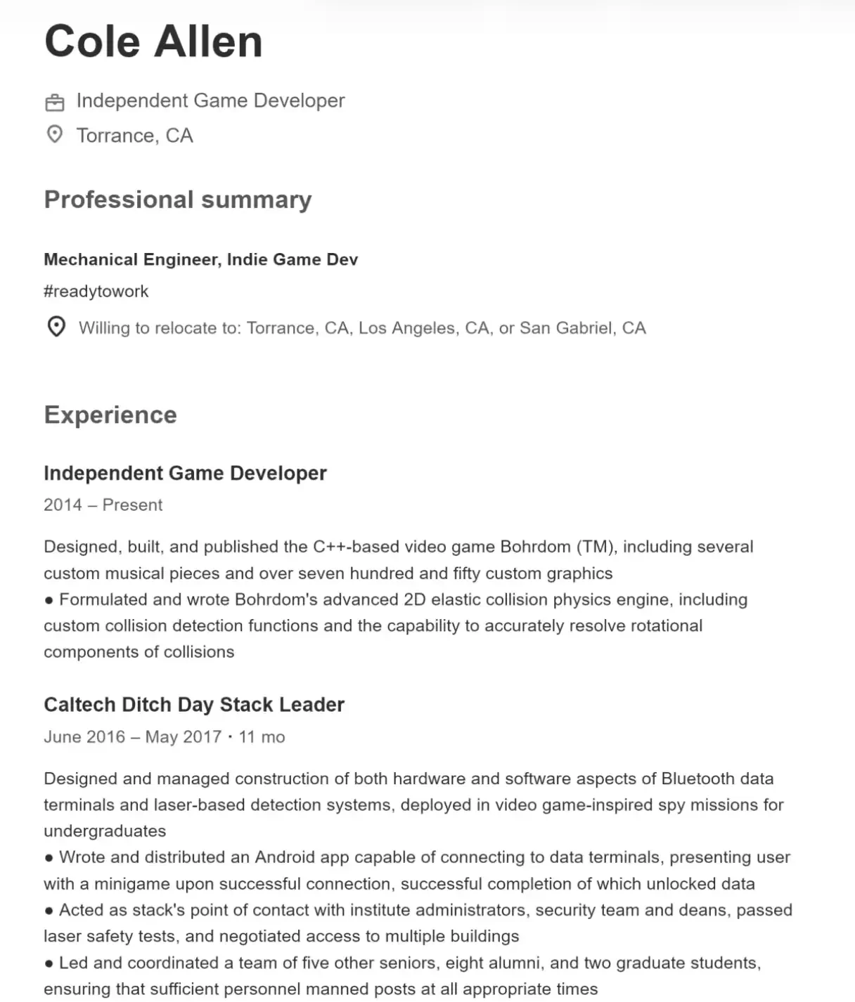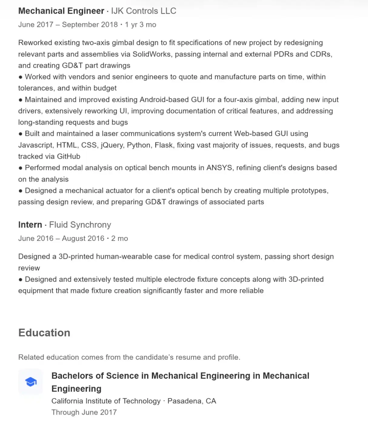工作上,他在南加州工程公司 IJK Controls 任机械工程师,主要从事精密机械系统设计(如云台结构)、光学平台分析等,同时也参与软件开发,包括安卓界面优化和基于激光通信系统的 Web 端开发。此外,他长期独立开发游戏,从底层物理引擎到图形、配乐全部自行完成。整体来看,他的背景横跨工程与软件,技术能力较为全面。