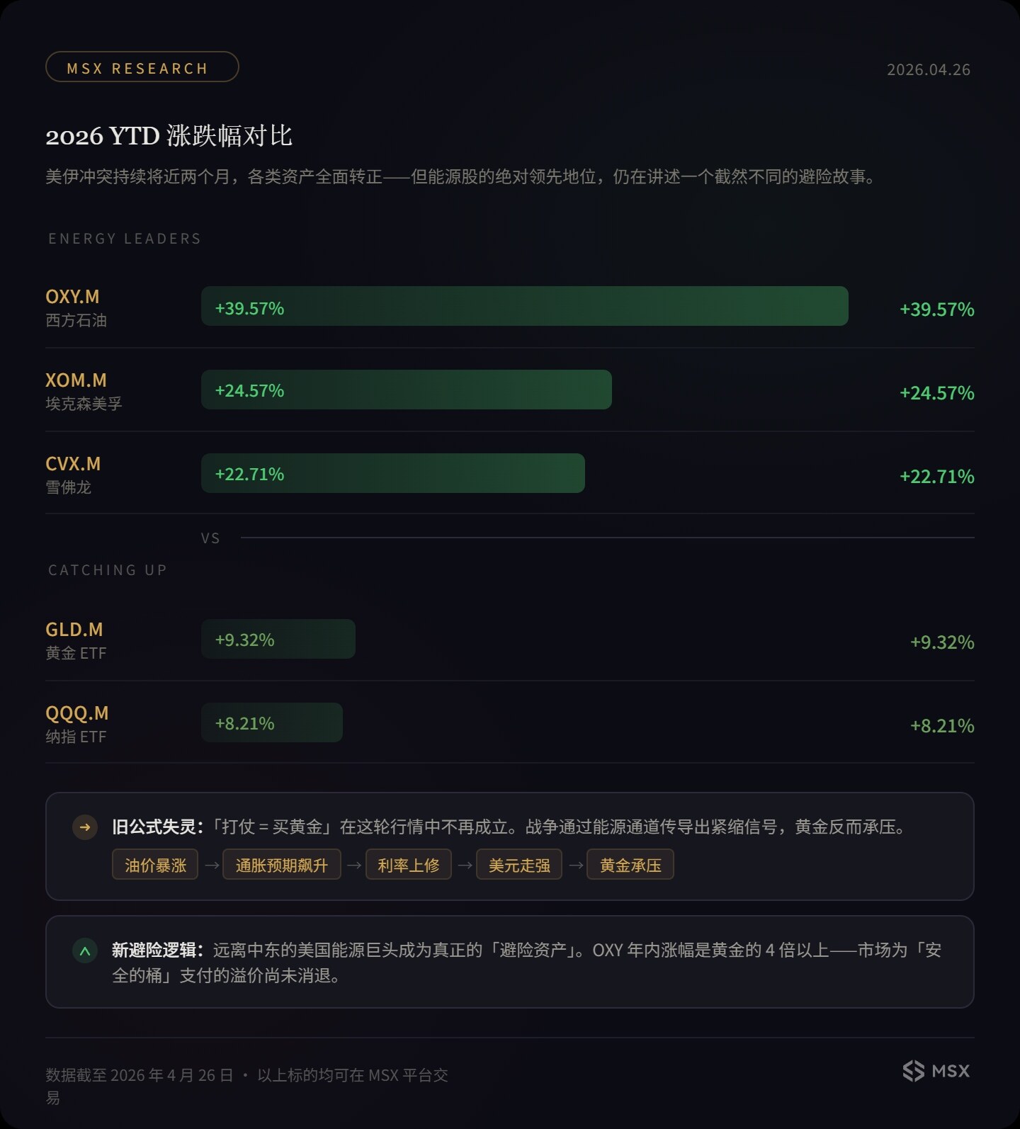 这解释了为什么 OXY.M、XOM.M、CVX.M 的涨幅显著高于黄金 ETF 代币和纳指 ETF 代币,因为市场避险逻辑从过去的「买黄金」,转向了「买确定性供给」,从过去的「躲进无息资产」,转向了「持有能够受益于供给短缺的现金流资产」。